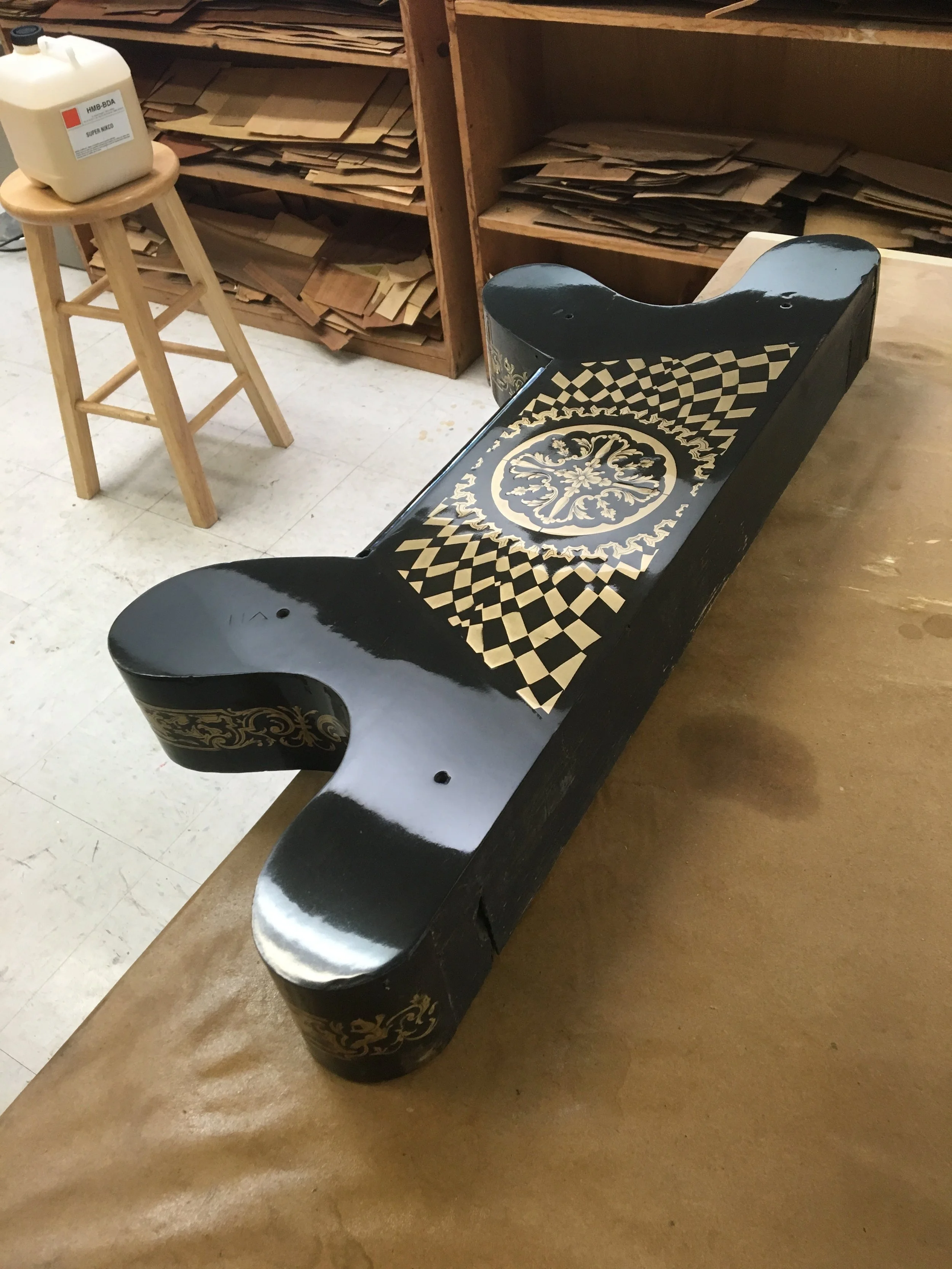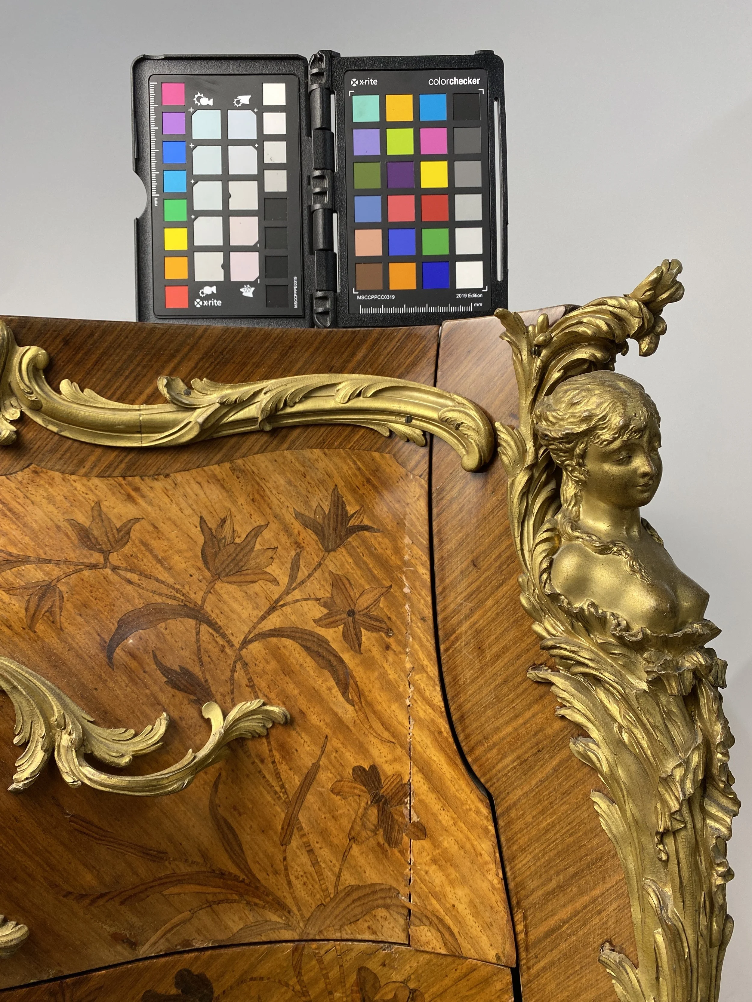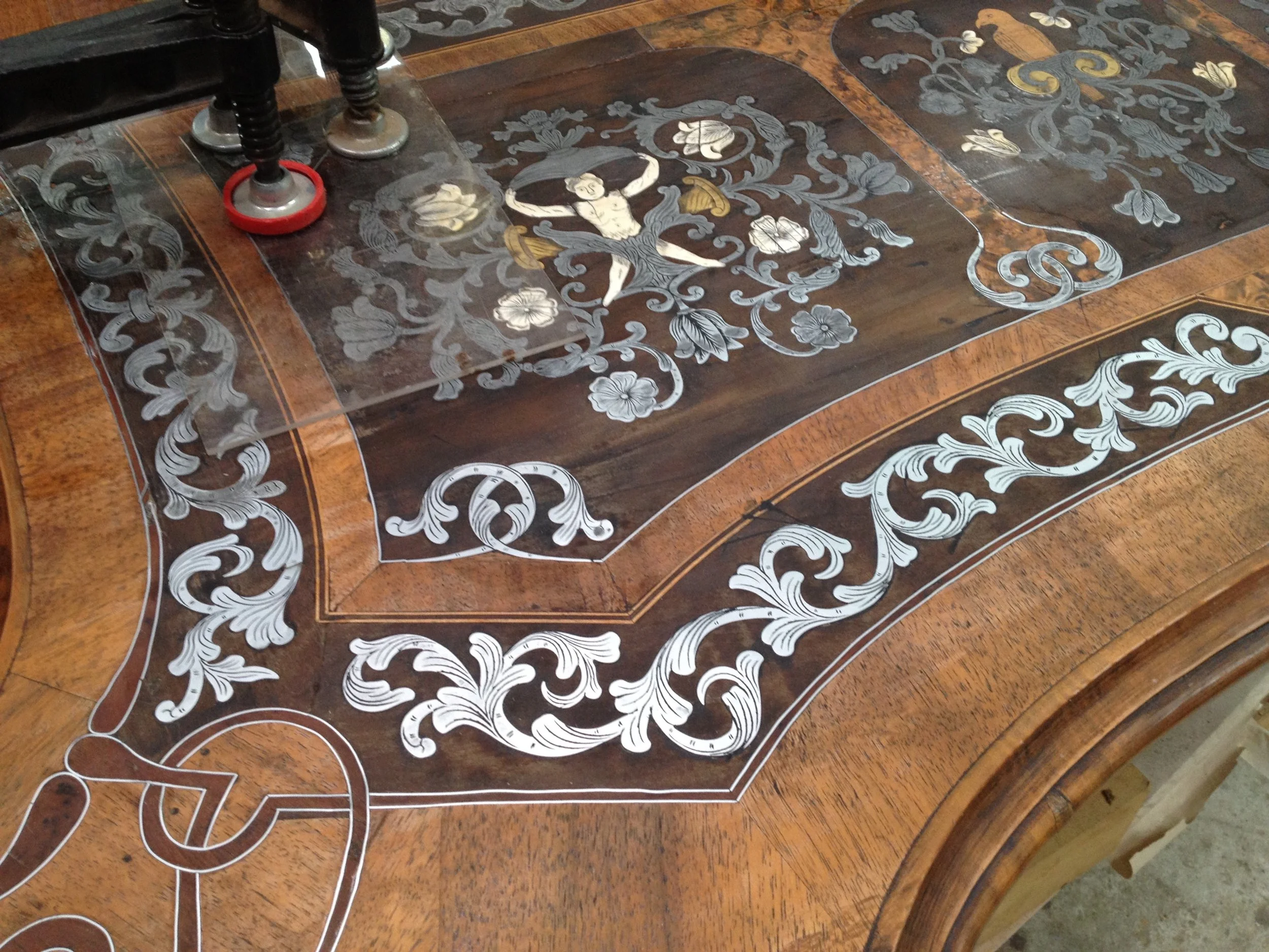 It is even truer for Boulle marquetry treatments which are usually composed of metal such as brass and pewter, tortoiseshell or horn, and wood veneers. The multiplicity of drastically different materials in Boulle surfaces increases the difficulties of any conservation treatment. We have developed skills and techniques to work on those challenging projects, such as the rehydration of shells and glues under vacuum.